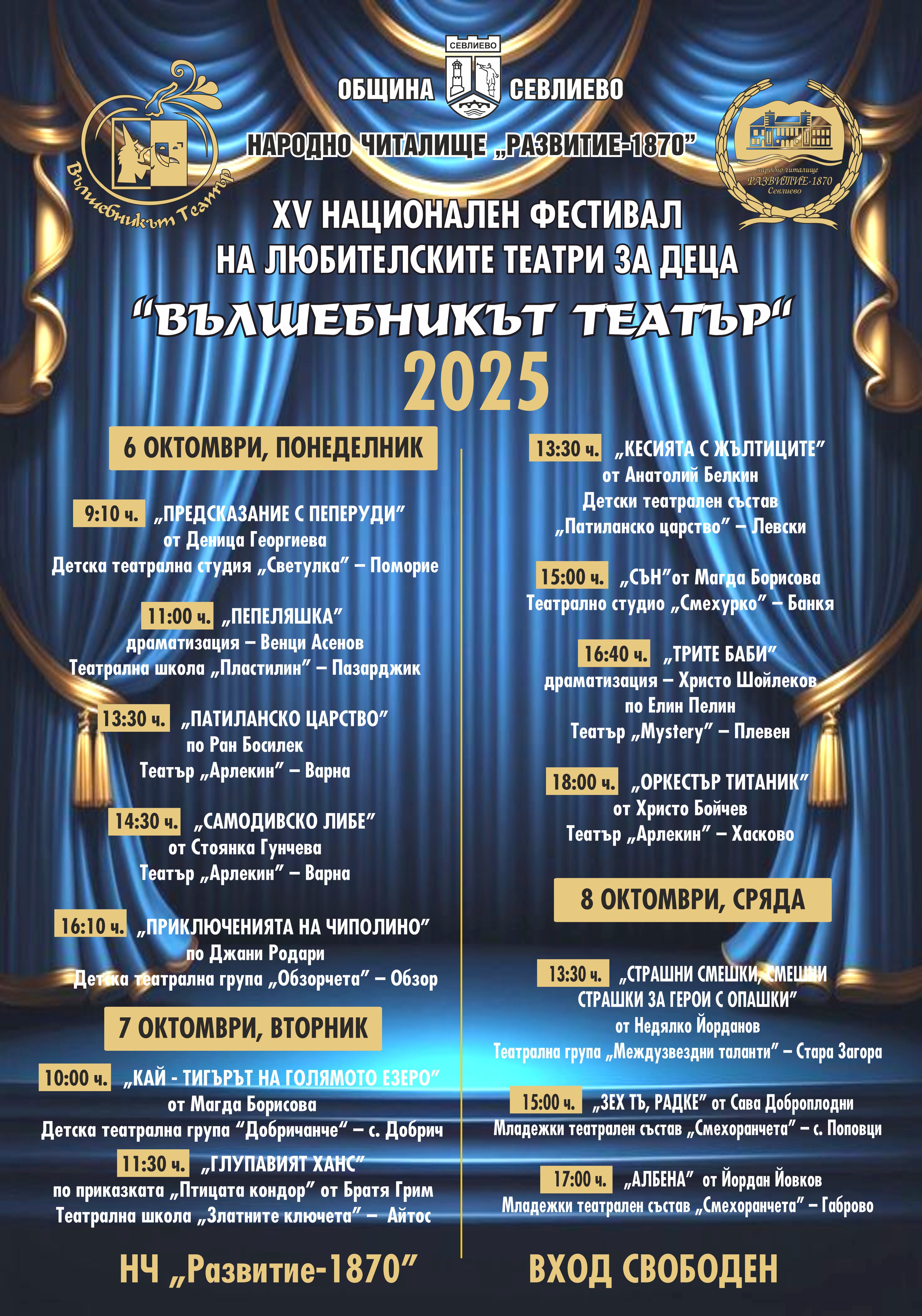 Участват любителски драматични и куклени театрални състави, представящи спектакли за деца и ученици. Фестивалът има конкурсен характер, представленията се оценяват от професионално жури. Спектаклите са безплатни, публика са деца от детските градини и учениците от всички учебни заведения в Община Севлиево. Предстои вълнуваща среща с театралното изкуство в дните от 6 до 8 октомври 2025 г.! Вход – свободен.