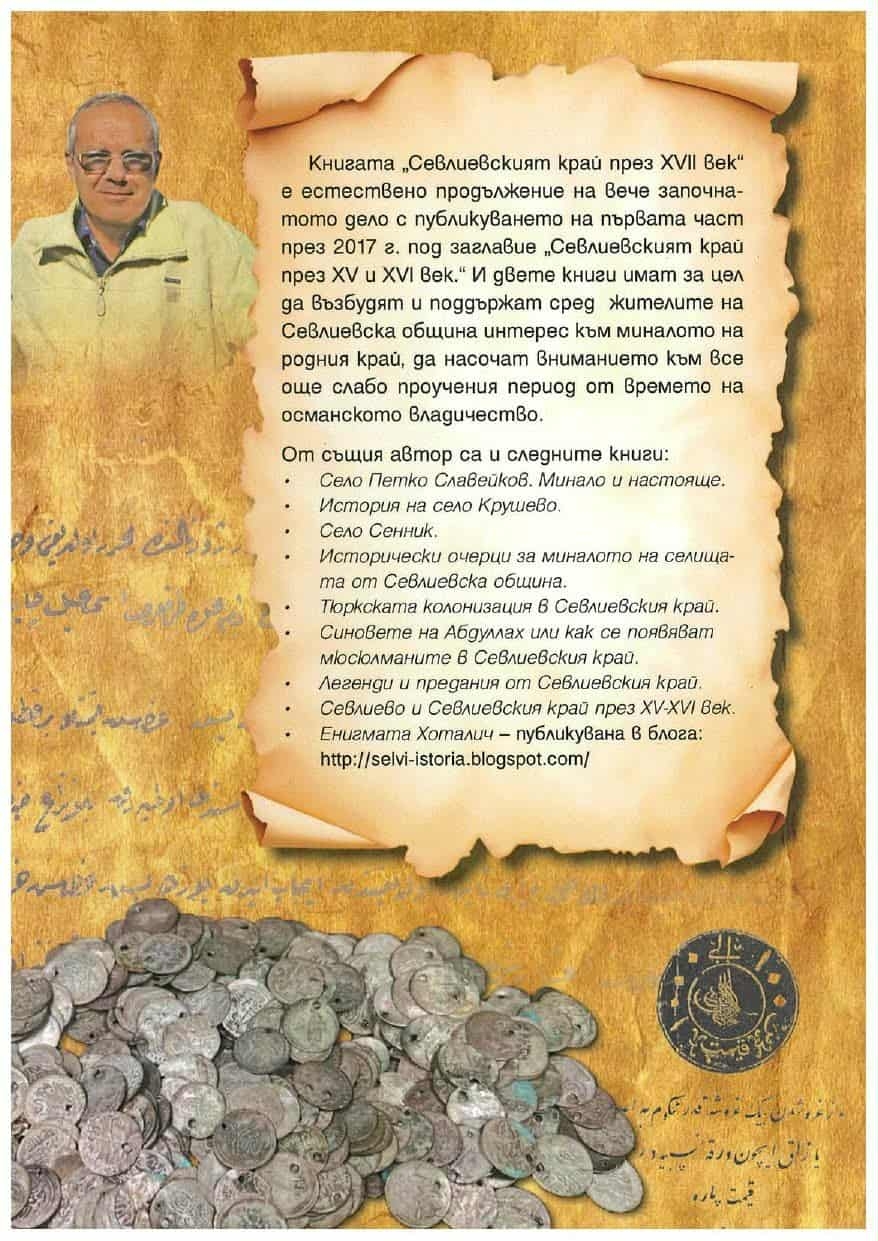 Представената книга е продължение на „Севлиевският край през XV и XVI век“ издадена през 2017 г и е втората част от замислена трилогия, разказваща за живота в нашия край от „тъмните“ векове на османското владичество по тези земи.