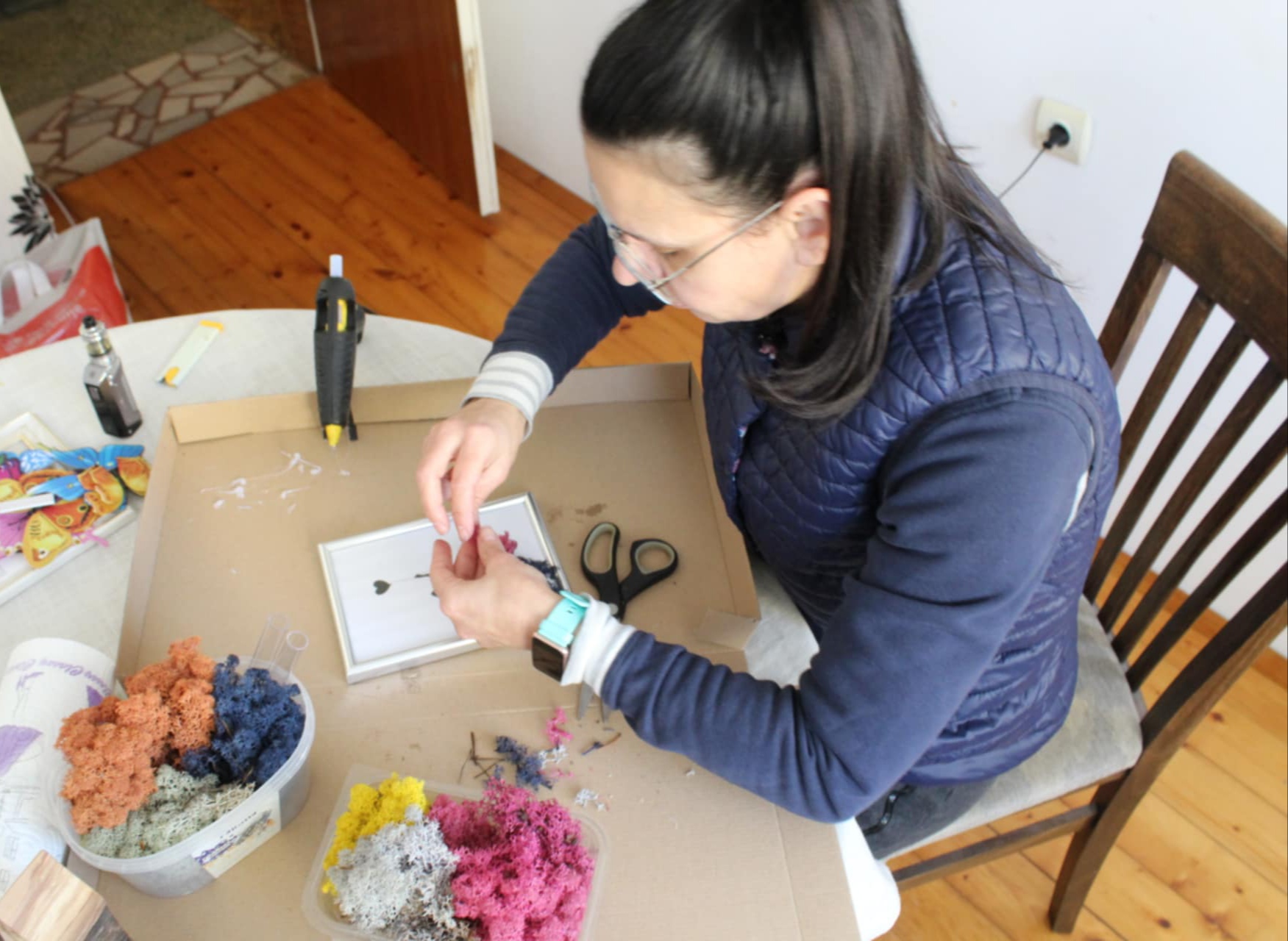 Изработката на картини от скандинавски мъх не изисква прилагането на специални умения или сложни техники. Единственото, което е нужно, е да имаш въображение и различни идеи. За Ирена този творчески процес е истински еликсир за душата, като концепциите за картините се зараждат естествено една след друга. Тя описва картините си като малки парчета природа, които носят усещане за спокойствие и свежест в дома. Използва  стабилизиран скандинавски мъх. Той е обработен и не изисква допълнителни грижи за поливане, а освен това пречиства въздуха от вредни вещества. Интересното е, че по него не полепва прах, като изисква само няколко прости правила – да не се излага на пряка слънчева светлина и да не се поставя под климатик.  Другите необходими неща за изработка на картините са лепило, дървена рамка, парче дърво в зависимост от размера и дизайна на картината, макетен нож или ножица и различни декоративни елементи при желание.