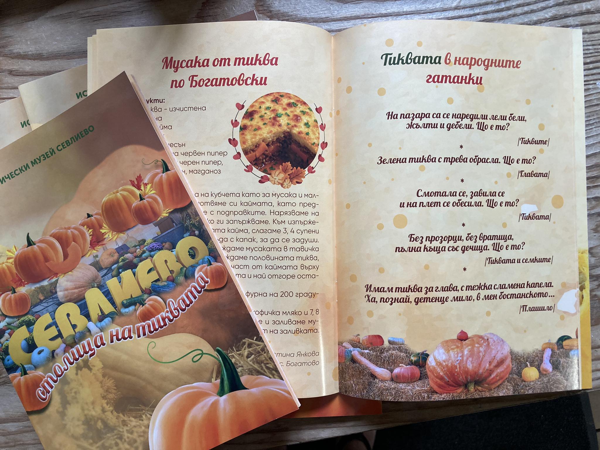 Най-новото пълноценветно издание „Севлиево столица на тиквата“ е книгата, която Исторически музей Севлиево издаде за Празника. В книжката ще откриете автентични готварски рецепти за сладки и солени тиквени изкушения от Севлиево, с. Хирево, с. Ряховците, с. Богатово и с. Градище. На страниците й ще откриете и много снимки, народни гатанки, поговорки, че и любовна магия с тиква!