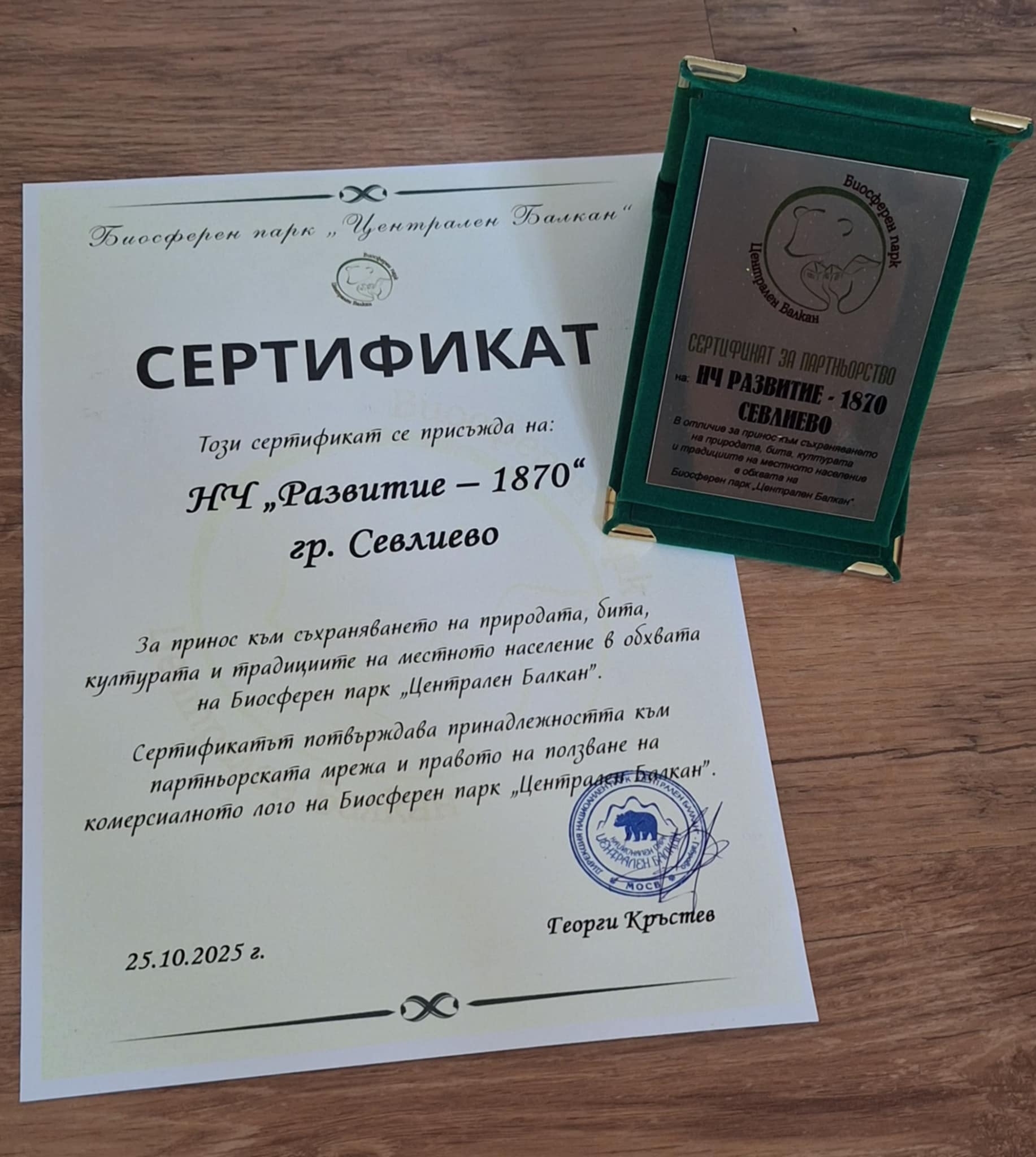 Народно читалище „Развитие-1870” получи плакет и сертификат за партньорство от Биосферен парк „Централен Балкан“. Отличието е символ на приноса на културната институция към съхраняването на природата, бита, културата и традициите на местното население в обхвата на Биосферния парк. Плакетът и сертификатът получи секретарят на читалището Десислава Димитрова по време на фестивала „Партньор на биосферен парк „Централен Балкан””. Събитието, подкрепено и домакинствано от Община Севлиево, организирано от Дирекция „Национален парк Централен Балкан“ се състоя на 25 октомври 2025 г. на площад „Свобода”. То беше второто от трите фестивални прояви, които се провеждат в три последователни седмици в градовете Троян, Севлиево и Карлово.