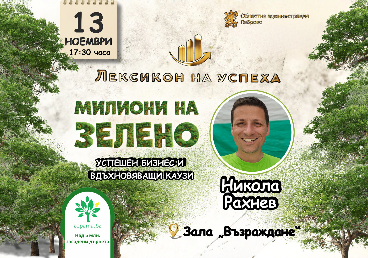Инициативата Лексикон на успеха продължава със среща с габровеца Никола Рахнев на 13 ноември от 17.30 часа в зала „Възраждане“ в Габрово. В Световния ден на доброто будителят на десетилетието ще сподели за пътя си като самоизградил се милионер, сериен предприемач и инвеститор, но и вдъхновен мечтател, засадил над 5 милиона дървета. Рахнев е организирал даряването на стотици тонове храна и още десетки каузи, които са докоснали сърцата на над половин милион българи.