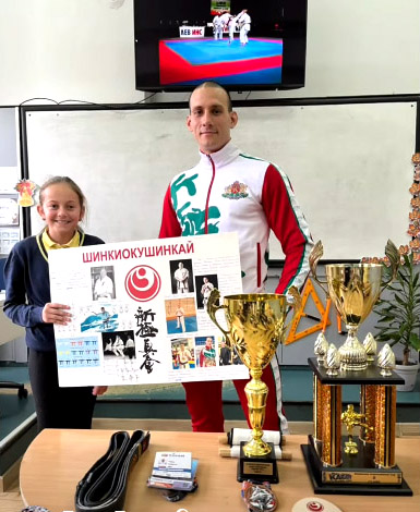 За богатата и вдъхновяваща история на каратето, подкрепена с интересен снимков и видео материал разказа пред четвъртокласници от ОУ „Стефан Пешев“ семпай Тодор Тодоров. Той разказа на децата за философията и културата на Шинкиокушинкай, за дисциплината и ценностите, които бойното изкуство изгражда у младите хора.