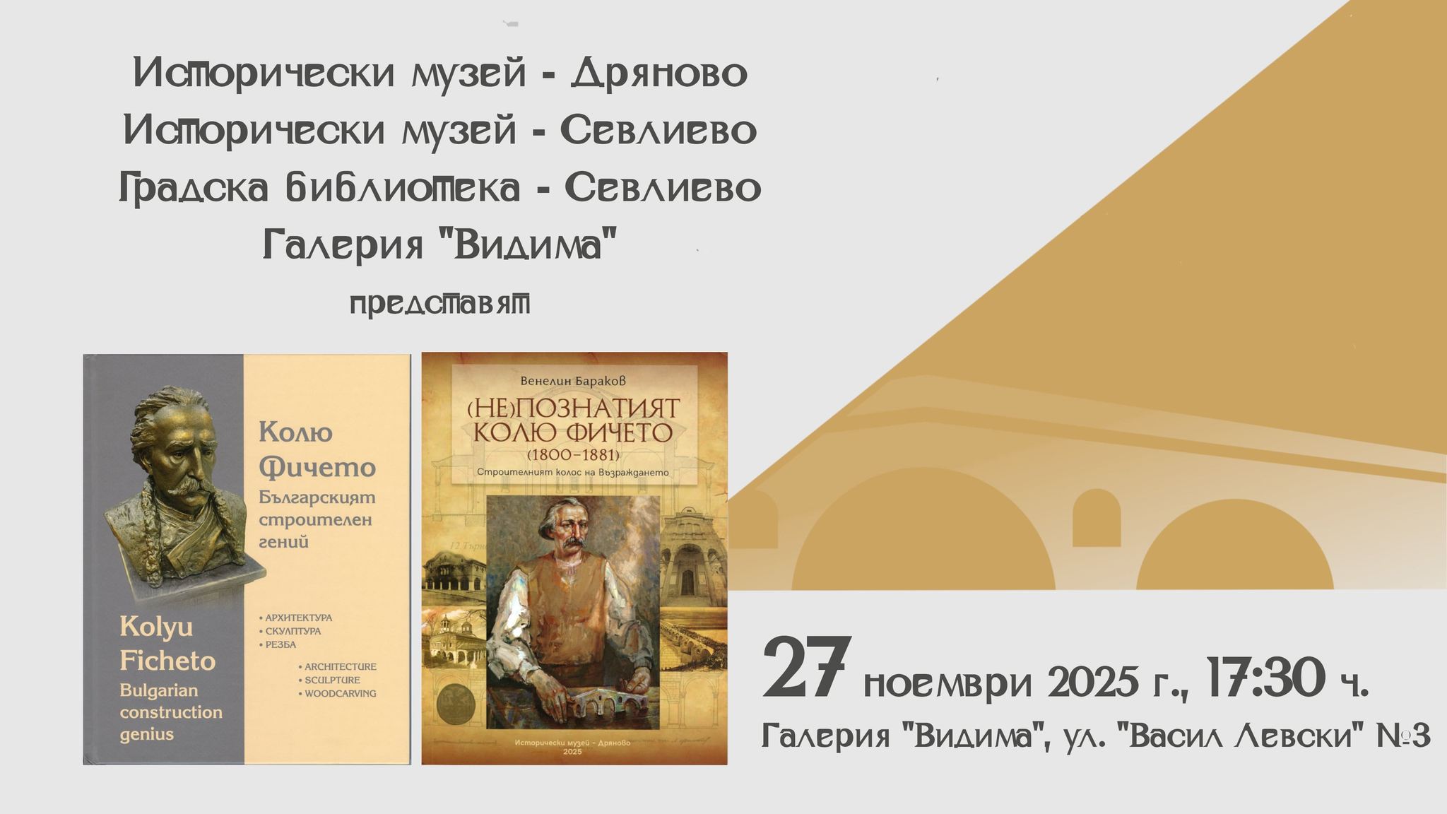 Исторически музей – Дряново ще представи на 27 ноември от 17.30 часа в галерия „Видима“ в Севлиево последните си две книги, посветени на Първомайстора – „Колю Фичето. Българският строителен гений“ и „(Не)познатият Колю Фичето. Строителният колос на Възраждането“.