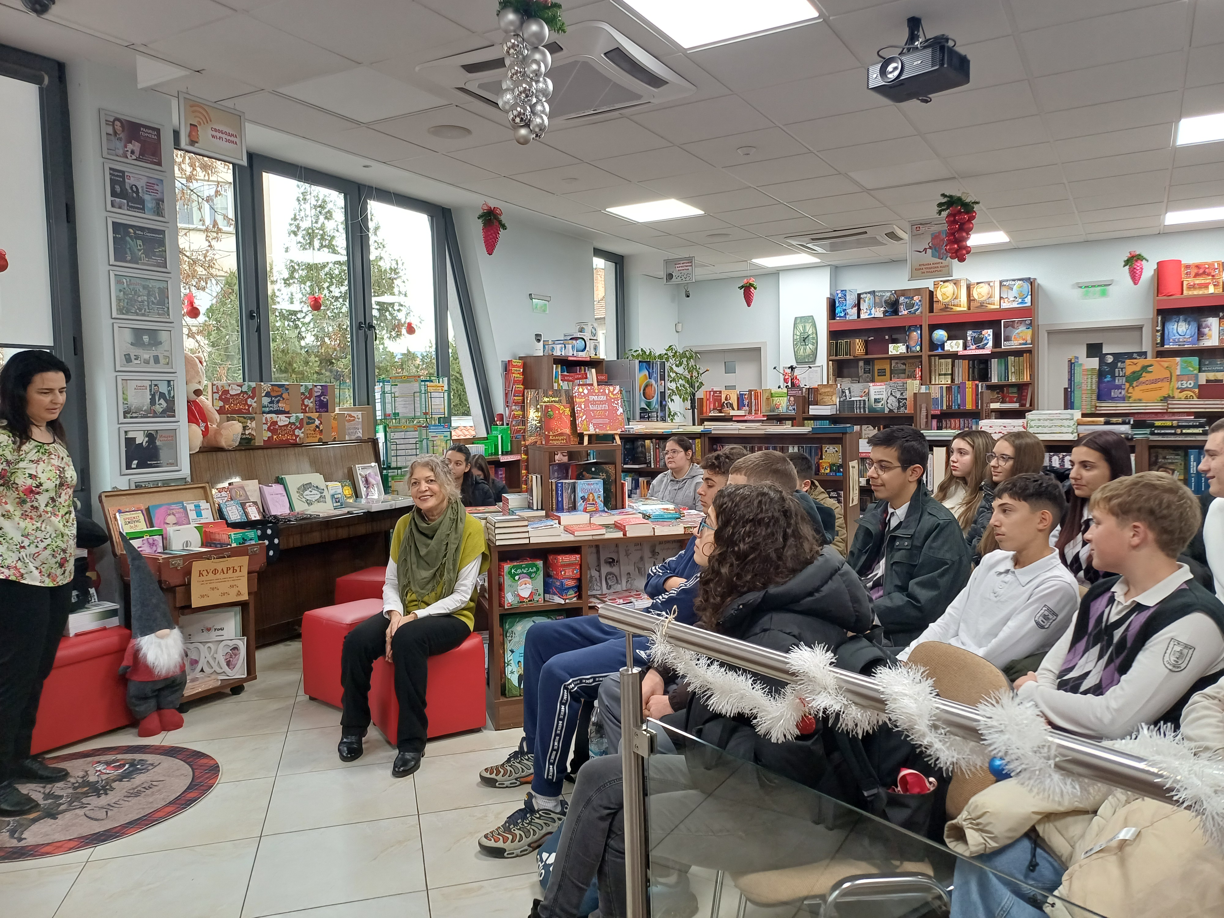 Инициативите по случай Деня на книгата – 21 ноември, продължиха и следващата седмица за деветокласниците с класен ръководител Даниела Йорданова. На 26.11.2025г. те проведоха своя час по Български език и литература в книжарница ,,М-прес“, където се срещнаха със Станислава Славова – Петкова, автор на сборника с разкази „Зелената количка“. Урокът се проведе в много приятна обстановка – сред книгите на втория етаж на книжарницата. Учениците бяха се подготвили предварително – разделени на групи, те бяха се запознали с няколко разказа от книгата и показаха своето любопитство, като задаваха въпроси, свързани с репликите на героите, със сюжета и с посланията на текста. Писателката беше приятно изненадана от интереса и предварителната подготовка на деветокласниците и с радост отговаряше на въпросите им.