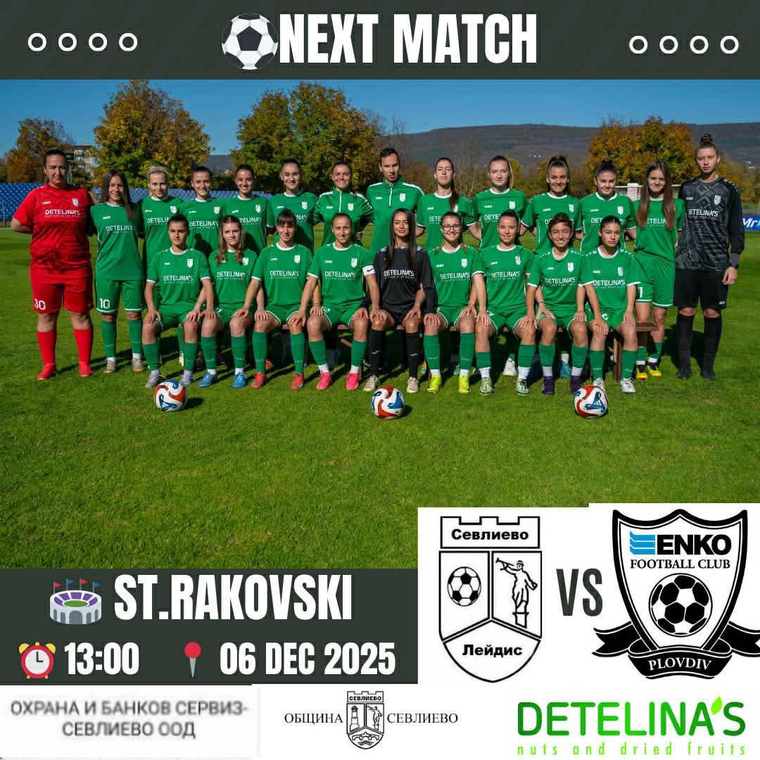 Тази събота, на 6 декември, от 13.00 часа, на стадион „Раковски“ нашите момичета от “Севлиево Лейдис” излизат за своя последен двубой за тази година срещу “Енко” Пловдив. Входът е СВОБОДЕН.