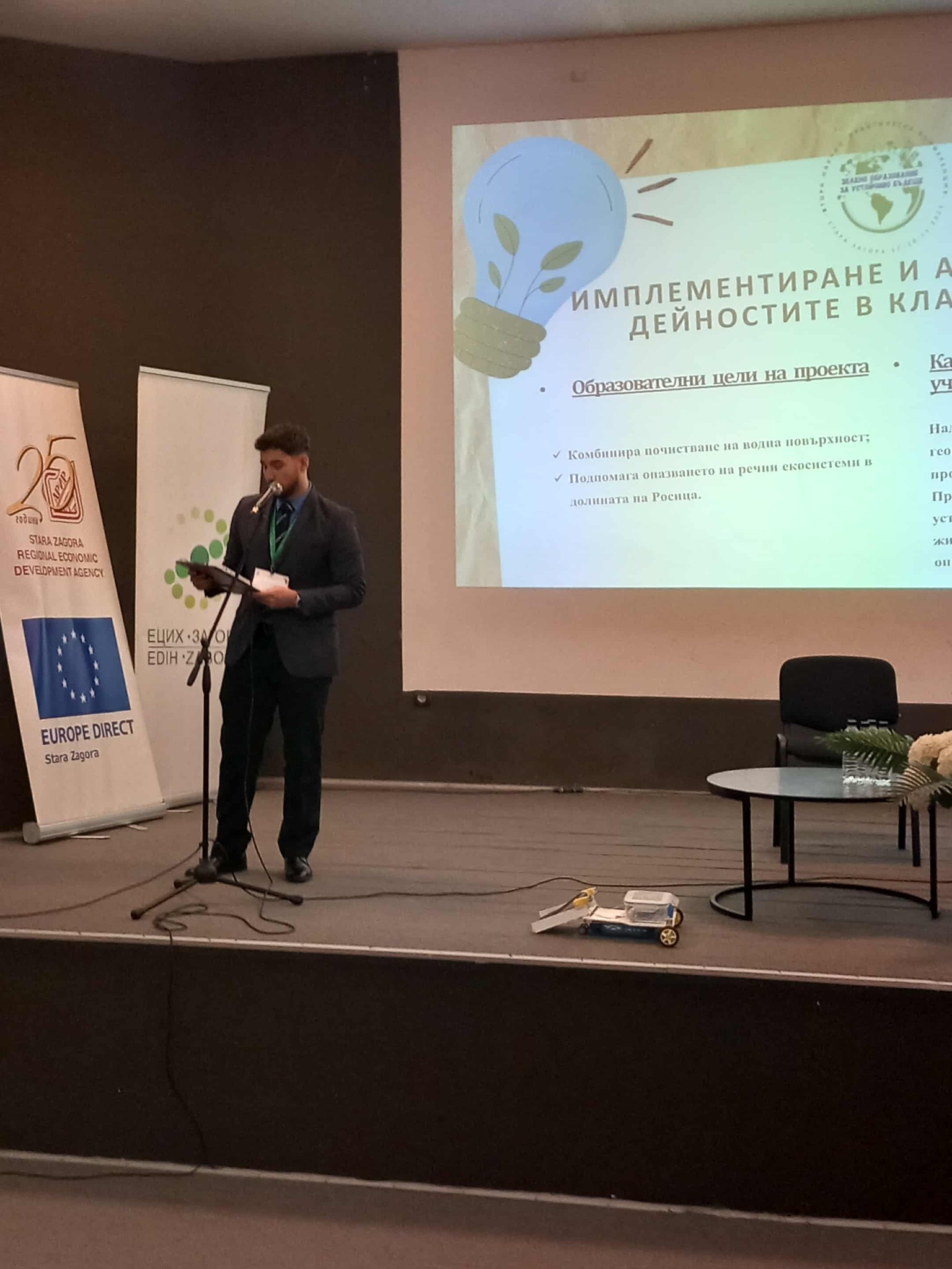 В рамките на конференцията се проведе конкурс за ученически STEM и екопроекти. От общо всички кандидатури до финалния етап достигнаха само 19 – сред тях и проектът на ученика от ПГМЕТ „Ген. Ив. Бъчваров“ Красимир Пенев. Той представи своя иновативен проект „Eco-Boat Station: Роботизирана система за почистване на речната долина на р. Росица“, разработен под ръководството на Ивелина Колева и инж. Маринела Делуди.