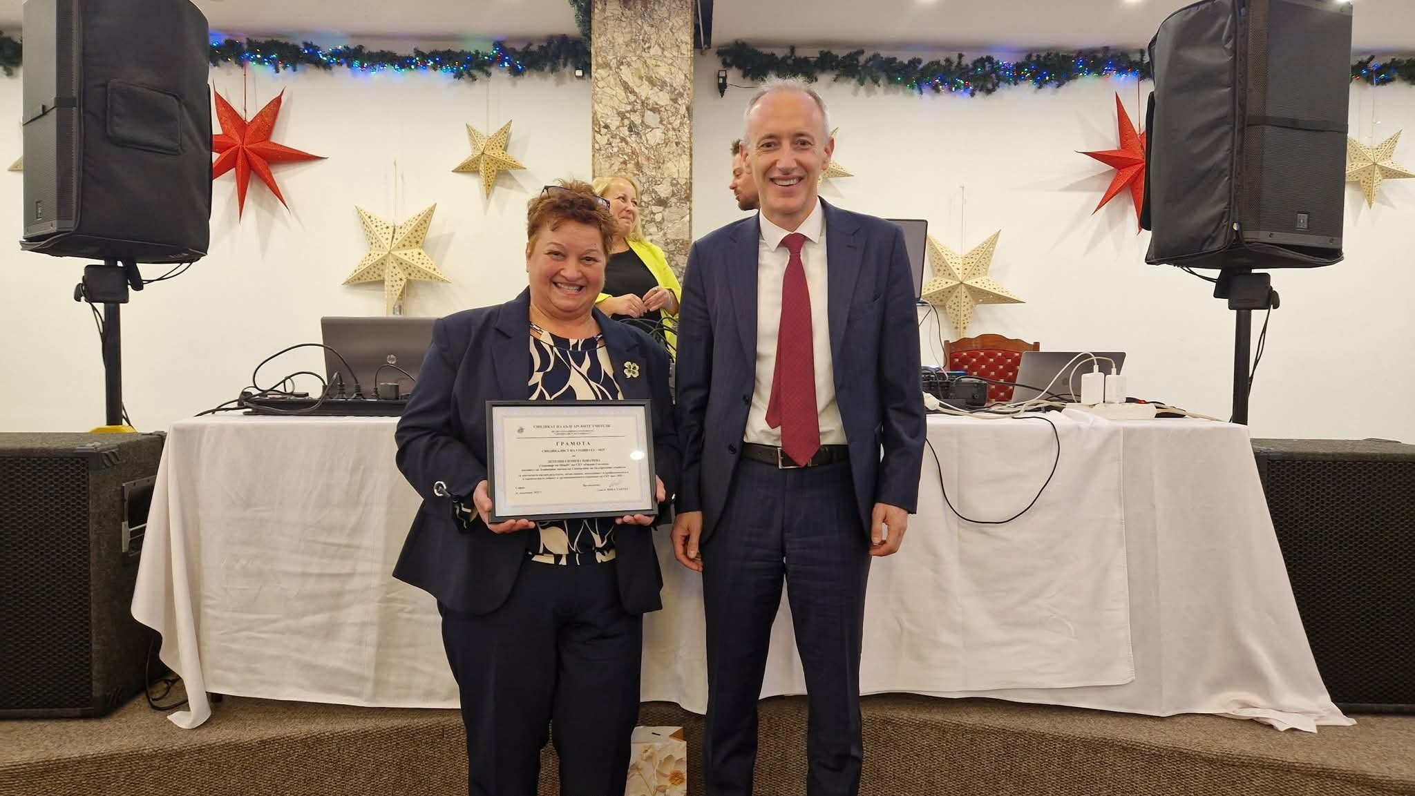 Заключителният етап на националните конкурси на Съюза на българските учители донесе заслужена награда на дългогодишния синдикален председател и заместник-председател на Общинския координационен съвет на СБУ Детелина Ковачева. Наградата в категория „Синдикалист на годината“ бе връчена на 19 декември, в Парк-хотел „Москва“ в столицата, където се проведе 44-ият Синдикален съвет на Синдиката на българските учители. На събитието присъстваха министърът на образованието и науката Красимир Вълчев, президентът на Конфедерацията на независимите синдикати в България (КНСБ) Пламен Димитров, вицепрезидентите на Конфедерацията Даниела Алексиева-Стоянова, Огнян Атанасов и д-р Тодор Капитанов, главният икономист на КНСБ и директор на Института за социални и синдикални изследвания и обучение (ИССИО) към Конфедерацията Любослав Костов, социални партньори на СБУ от регионалните управления на образованието, директори на училища. Сред гостите на форума беше и началникът на РУО – Габрово Георги Маринов.
