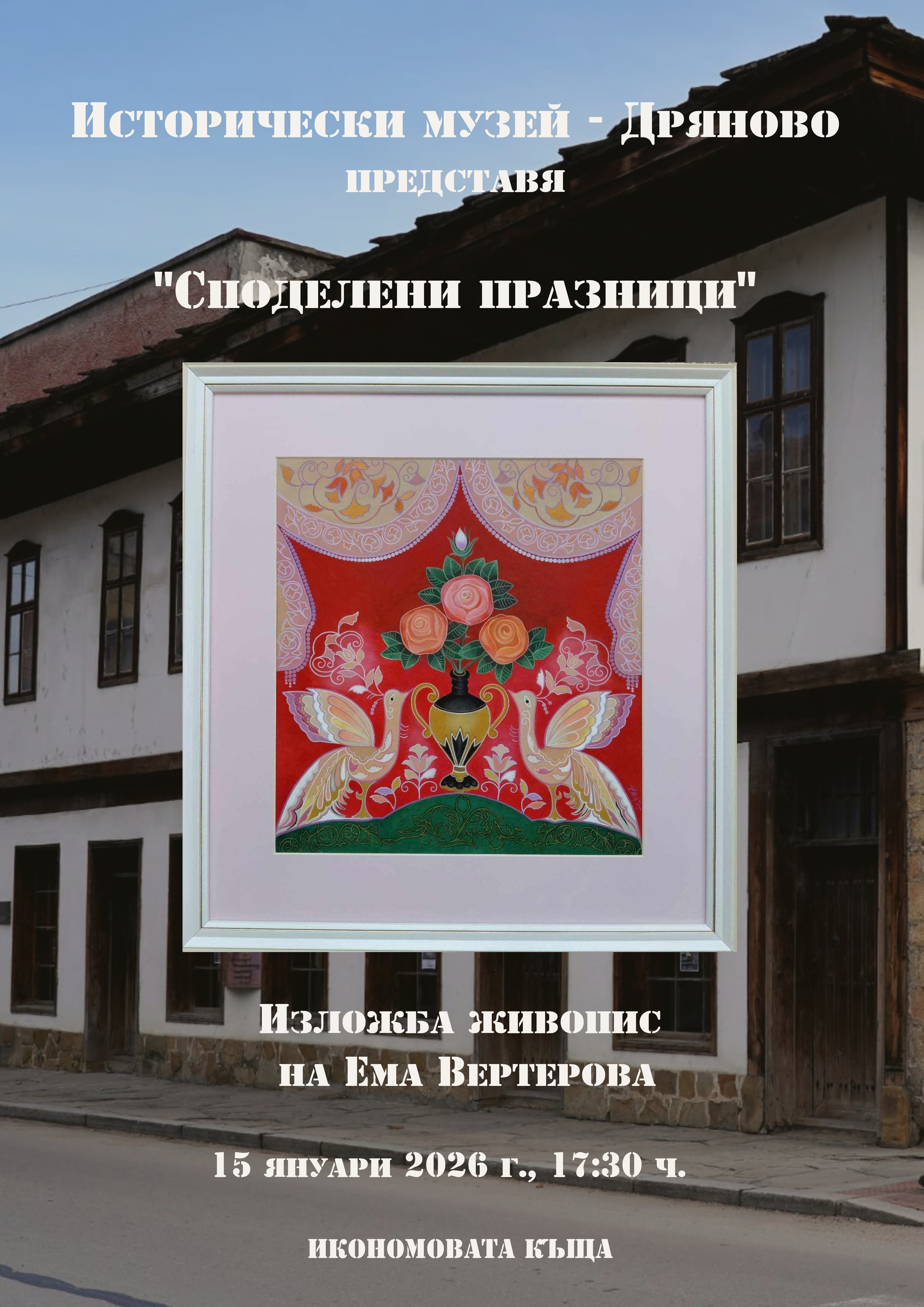 На 15 януари, четвъртък, от 17.30 часа Исторически музей – Дряново ще бъде домакин на среща с художничката Ема Вертерова. Събитието ще се състои в Икономовата къща, където ще бъде открита нейната изложба „Споделени празници“ – живописна разходка из световете на българското Възраждане, обагрена с декоративна хармония и емоционален колорит.