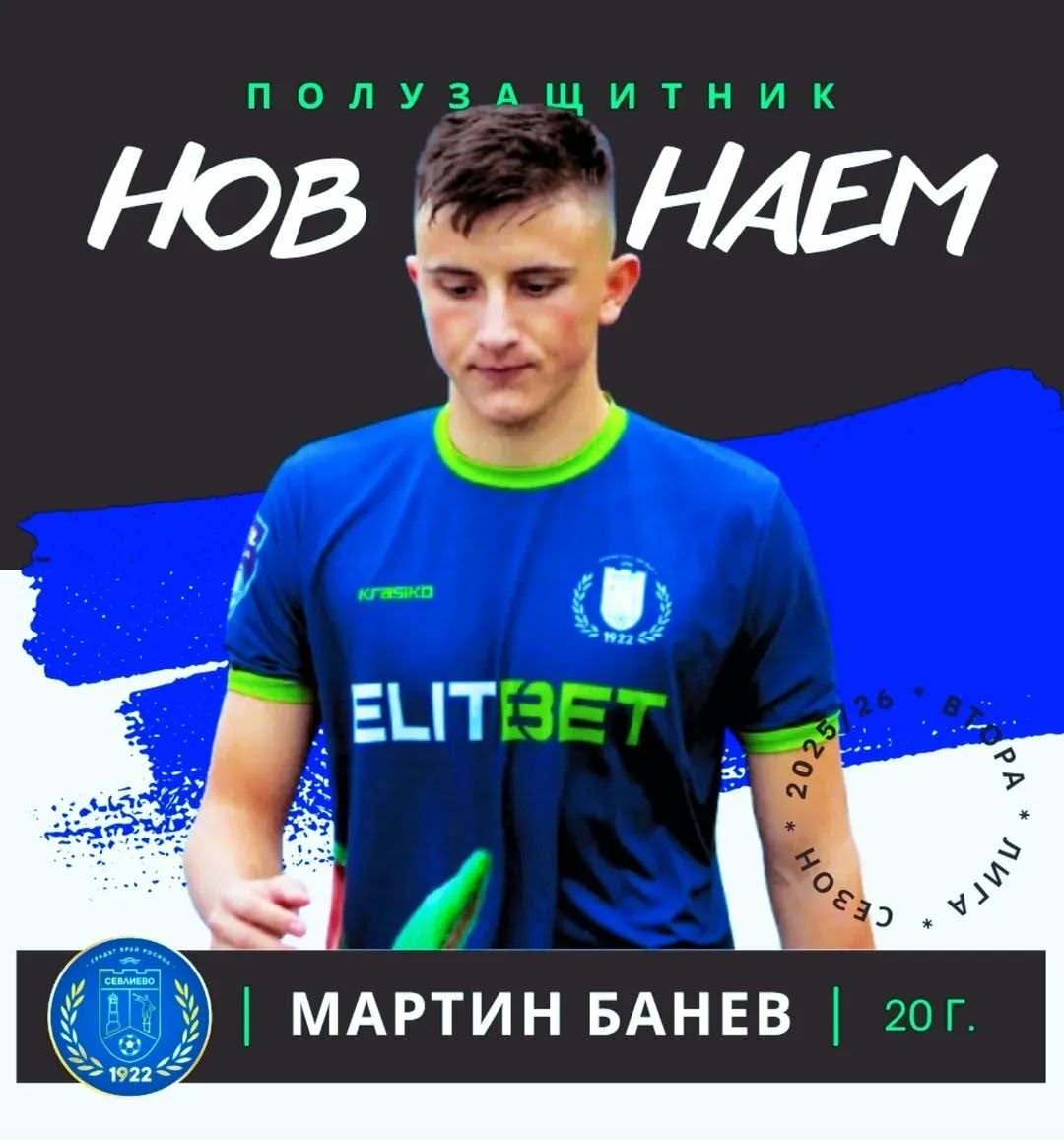 Талантливият полузащитник Мартин Банев ще носи синия екип до края на сезон 2025/26 във Втора лига. Наемът на 20-годишния халф беше удължен с нови шест месеца, след договорка между ФК „Севлиево“ и родния му „Черно море“ (Варна). Ръководствата и на двата клуба са останали доволни от развитието на младока, като от щаба на „моряците“ разчитат той да натрупа още повече опит в Севлиево.