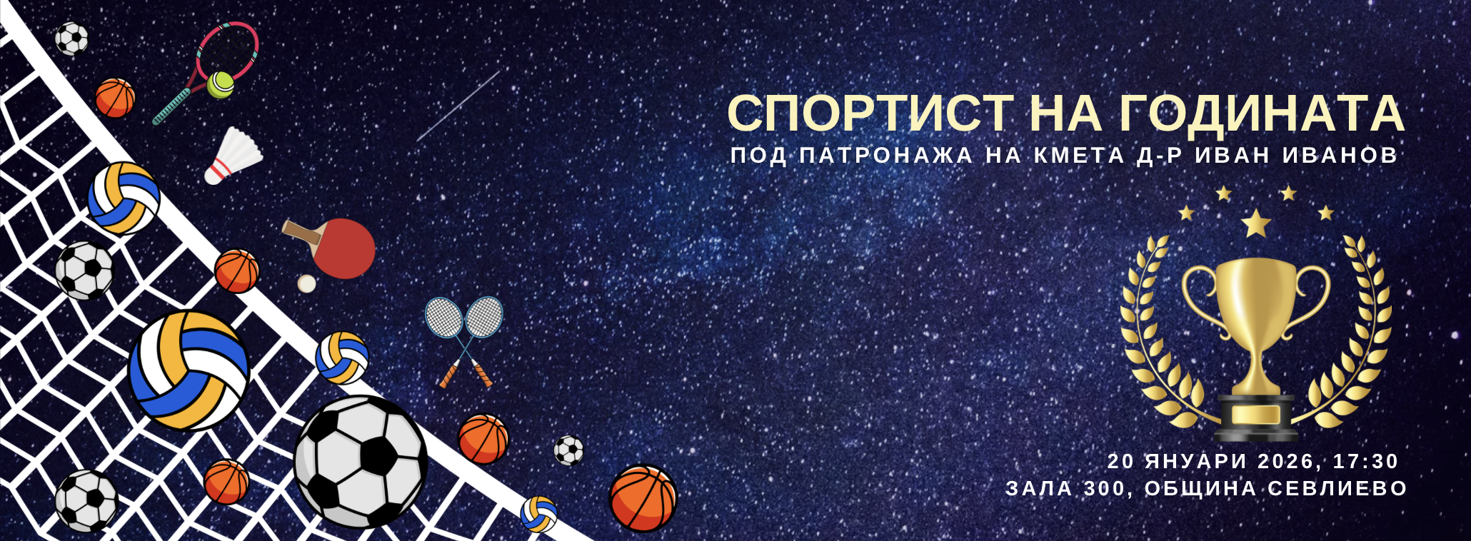 На официална церемония Община Севлиево ще отличи най-добрите спортисти за 2025 г. Награждаването ще се проведе на 20 януари, от 17.30 ч, в зала 300, в сградата на Общината. Събитието традиционно е под почетния патронаж на кмета общината д-р Иван Иванов. Церемонията е израз на признателност към упоритата работа, дисциплината и високите постижения на нашите спортисти и техните треньори, които прославят името на града на национални и международни форуми.