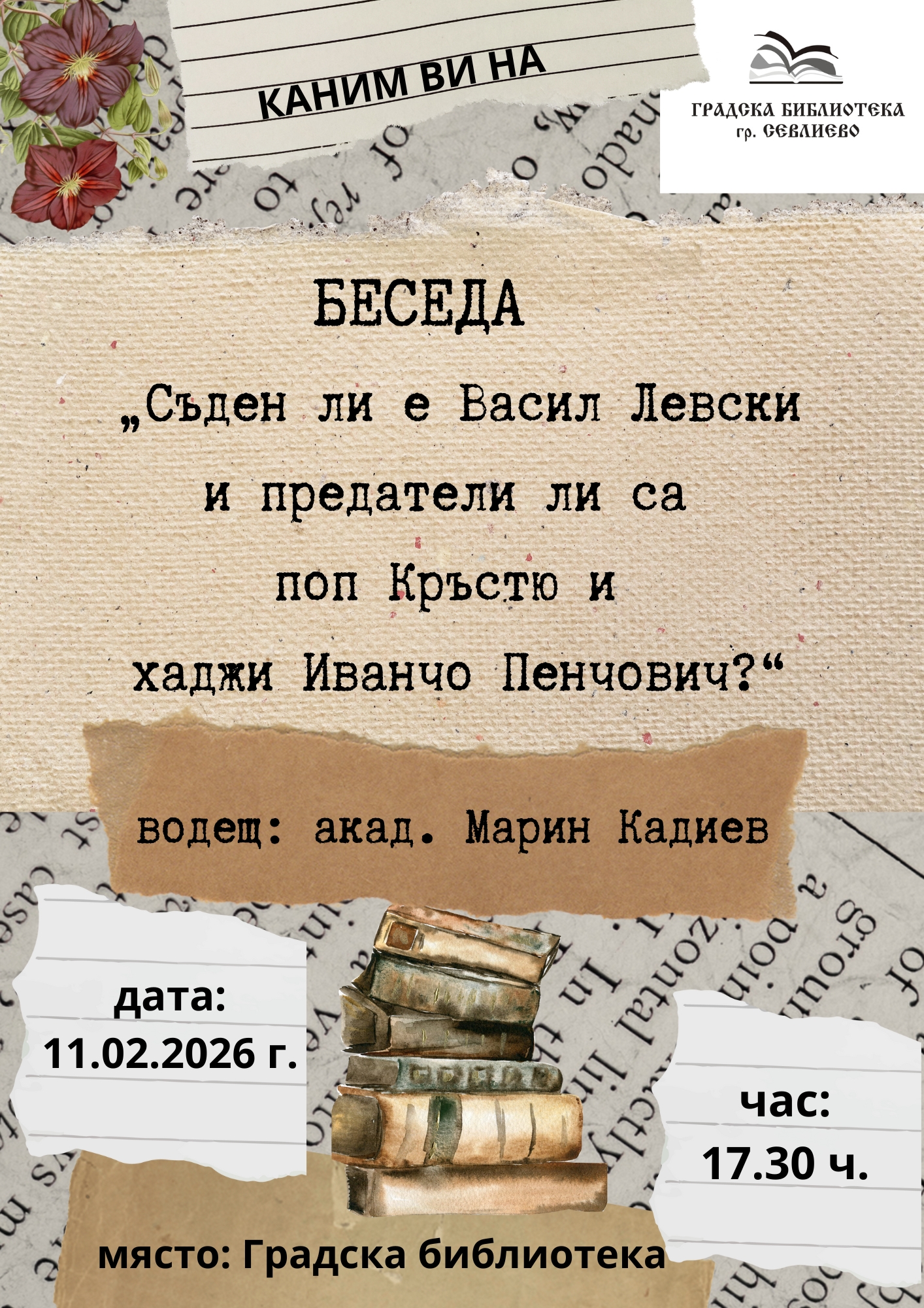 На 18 февруари ще се навършат 153 години от смъртта на Васил Иванов Кунчев – Левски, Апостолът на свободата. По този повод Градската библиотека в Севлиево организира среща – разговор на 11 февруари от 17.30 ч. с академик Марин Кадиев на тема: „Съден ли е Васил Левски и предатели ли са поп Кръстю и хаджи Иванчо Пенчович“. Тя се проведе в Залата за събития в библиотеката.