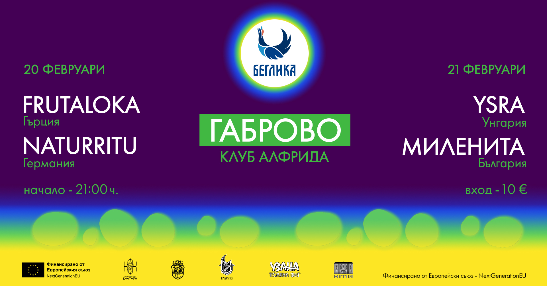 В рамките на два дни, 20 и 21 февруари в клуб “Алфрида” зимното издание на “Беглика” под надслов “Да се сберем в Габрово” ще представи богата палитра от съвременни музикални, визуални и перформативни проекти от Европа и отвъд. Програмата включва артисти и колективи с доказано международно присъствие и отличителен артистичен почерк, създавайки пространство за междукултурен диалог и обмен между българската и международната сцена. Подбраната селекция от събития предлага балансирано съчетание от музика, визуални изкуства и живи артистични намеси, които срещат различни културни традиции със съвременни интерпретации. ““Музикалната програма на събитието представя разнообразна селекция от международни и български артисти, работещи на пресечната точка между традиционни влияния и съвременни музикални форми. Сред участниците са Frutaloka (Гърция) с енергично и танцово звучене, вдъхновено от балканската и средиземноморската музика, NATURRITU (Германия) с атмосферни лайв сетове, съчетаващи етнически мотиви и електронна музика, както и YSRA (Унгария), чийто проект смесва психеделични, поп и етно елементи в модерен независим контекст.
