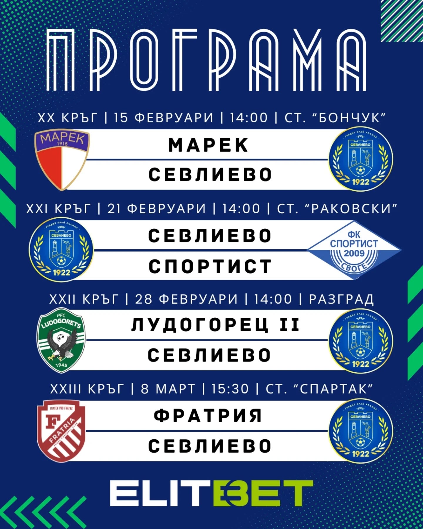 Спортно-техническата комисия на БФС утвърди преди дни програмата на футболните Първа и Втора лига до 9 март. За елитната група мачовете са насрочени от XXII до XXV кръг, за втора дивизия – от XXI до XXIII.