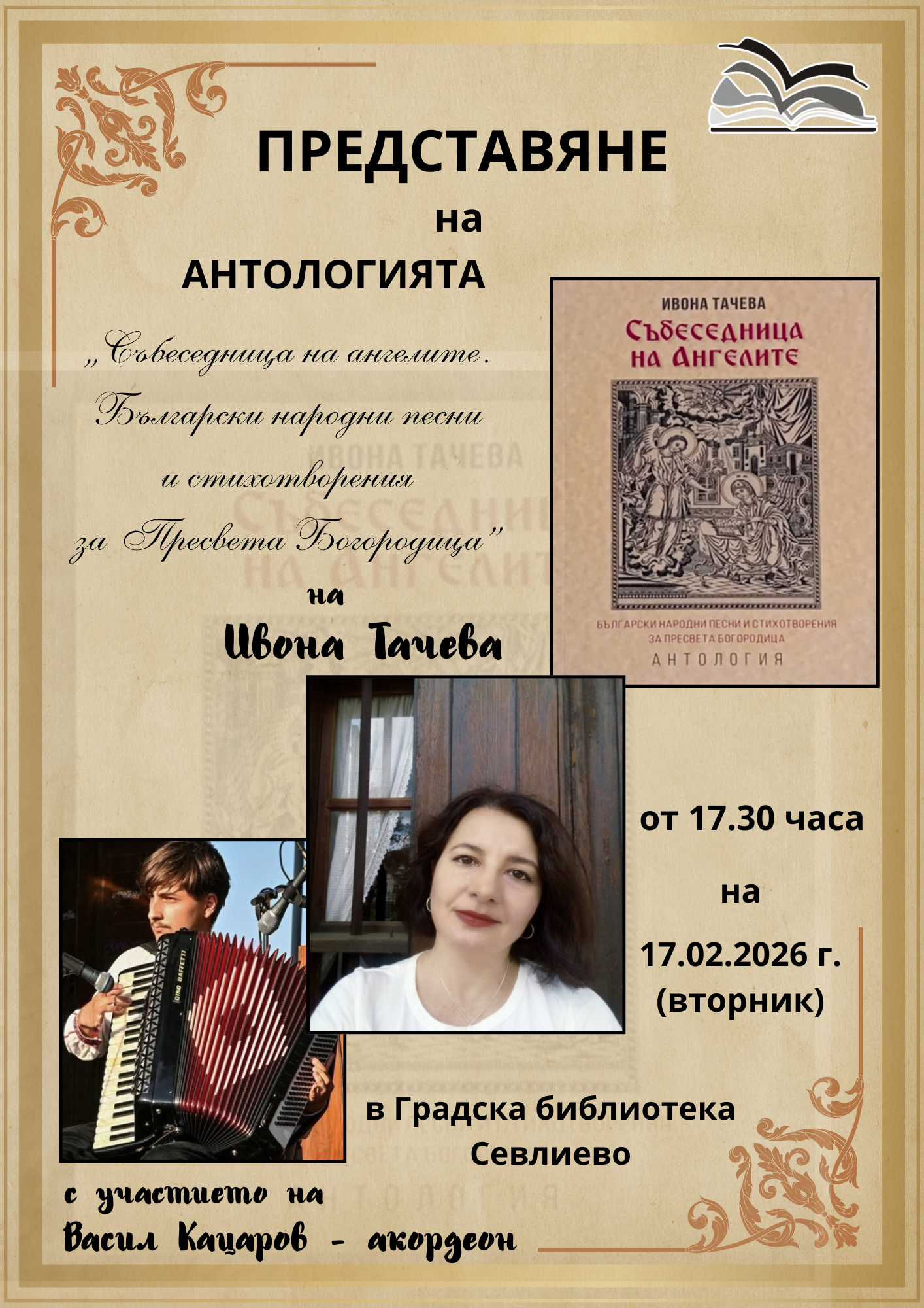 На 17 февруари (вторник) от 17.30 часа в Градска библиотека ви каним на интересно и предизвикателно събитие, което събира на едно място книга, поетеса и млад музикант. Събират се народно и авторско творчество и творчеството на съставителството, обогатено с изпълненията на талантлив акордионист.