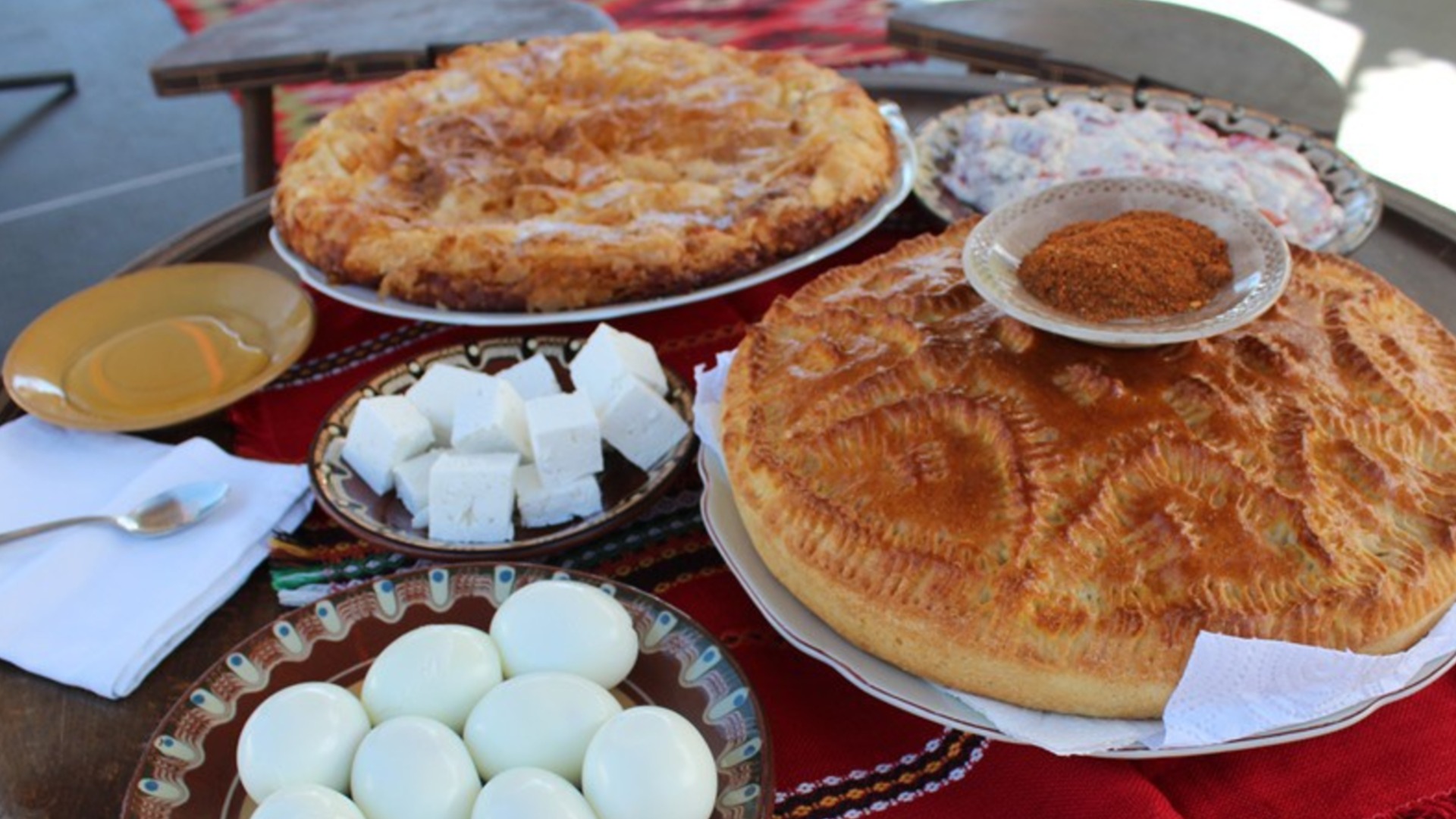 На празничната трапеза има винаги млечни и яйчени продукти: баница със сирене, варени яйца, халва с орехови ядки. Прието е да се извършва обичаят „хамкане“ (ламкане, ласкане): на конец (кълчищен, червен или мартеница), окачен на греда на тавана над трапезата, се завързва сварено обелено яйце, парче бяла халва или въглен. Конецът се завърта в кръг и всеки член от семейството, главно децата, се опитва да хване яйцето (халвата, въглена) с уста. Следват обредни действия и гадания: конецът, след наричания, се пали и по начина на горене се гадае. Яйцето и въгленът се запазват с лечебна цел. С водата от варенето се мият лицата на другия ден (Чисти понеделник) за предпазване от бълхи и мухи; черупките се изхвърлят на улицата пак против бълхи.