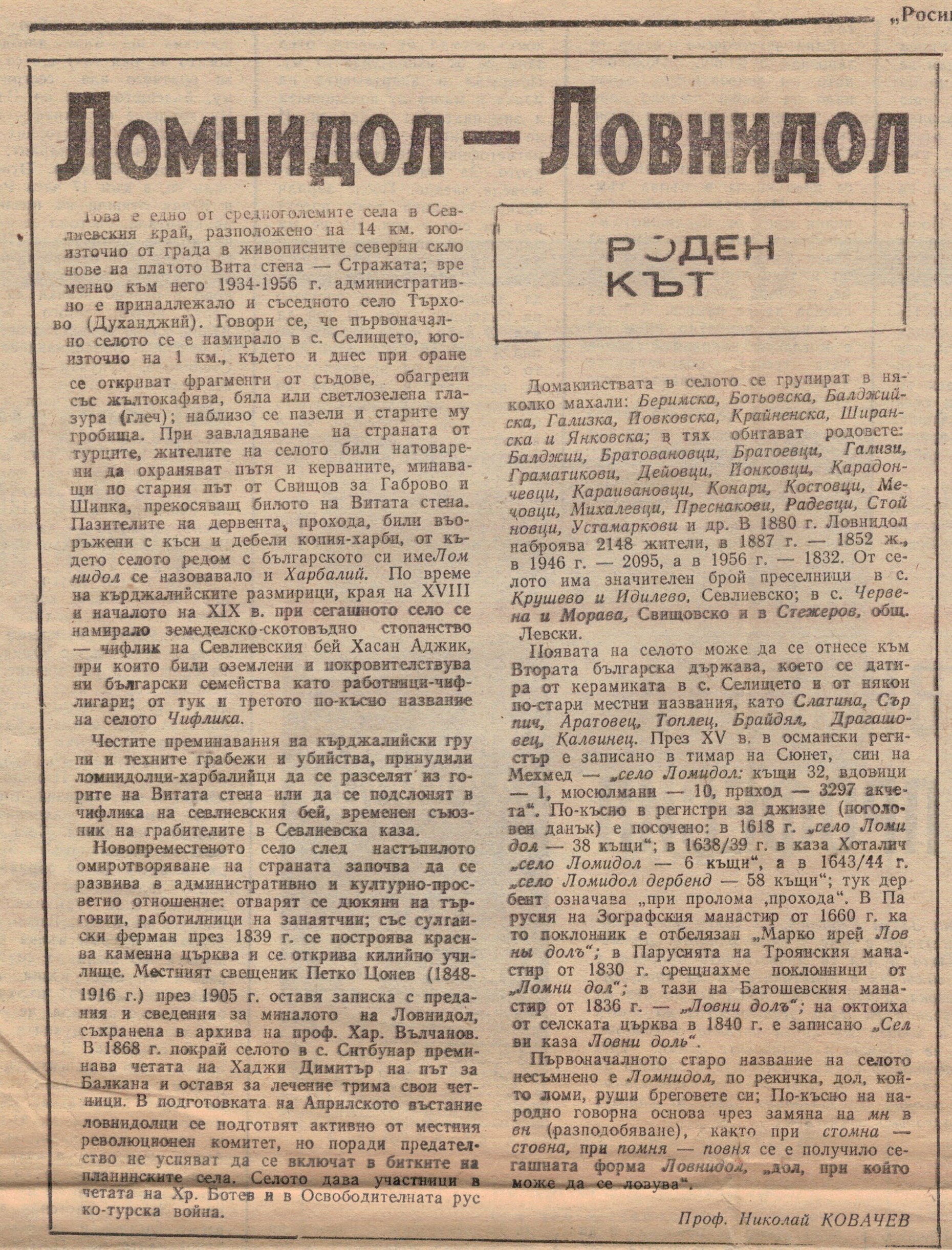 Зачитам се в статията… автор проф. Николай Ковачев. Дали тази статия положи за мен началото да се интересувам от историята на селото и кога какво е публикувано в пресата – не знам, но като че ли от тук тръгна интересът ми да се научат факти от селото, стари събития, случки… и къде те са публикувани…