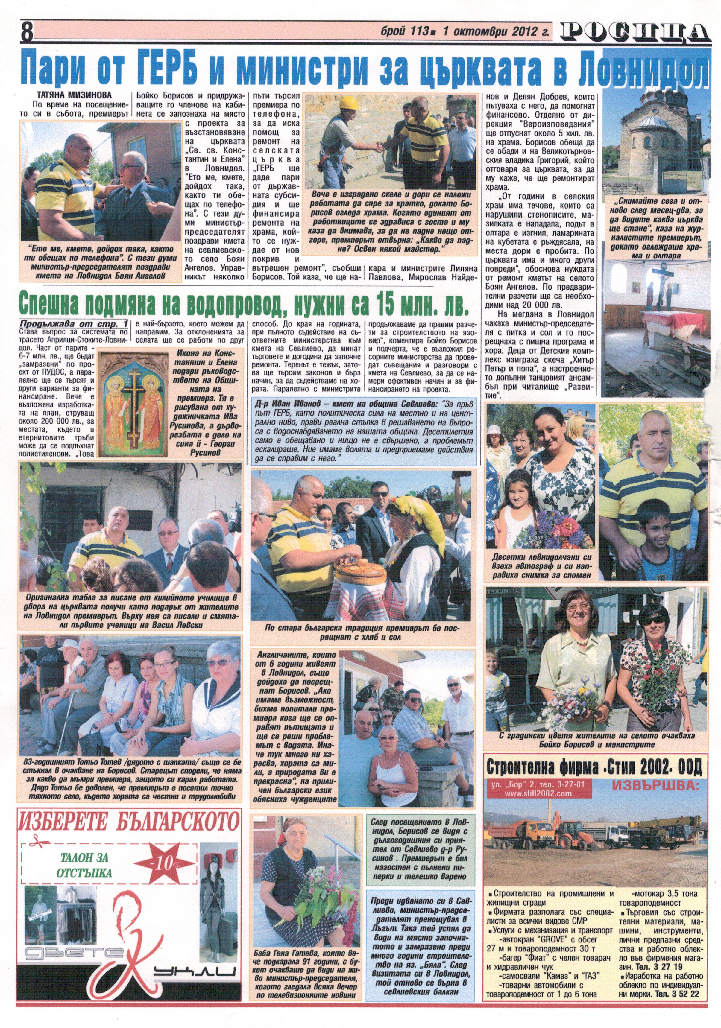 Отново се връщам към конкретен случай… Годината е 2012-та, в село Ловнидол с няколко министъра идва министър-председателят на България Бойко Борисов, за да открие ремонта на покрива на църквата «Св.св. Константин и Елена». Аз не съм била в страната, пробвам чрез Гугъл да намеря някаква информация – Гугъл не ми отговаря нищо. Как да намеря материал за това събитие, какво точно се е случило тогава? Звъня на журналистката Мая Ганева и моля, ако нещо е писано да ми го изпрати. Получих цяла една страница на вестник «Росица», брой 113, 1 октомври, 2012, цветна…