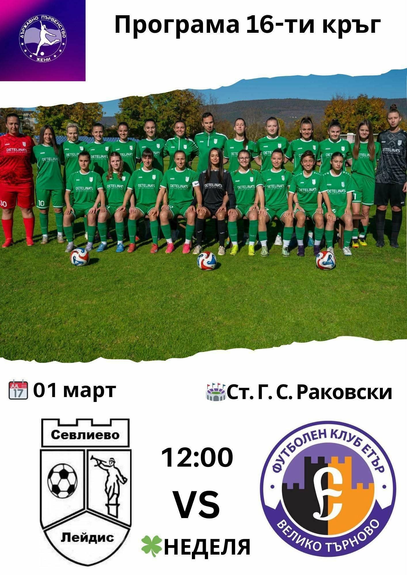 Двубоят от Държавното първенство по футбол за жени, между „Севлиево Лейдис“ и „Етър“, който трябваше да се изиграе на 22 февруари, ще се изиграе на 1 март. Припомняме, че мачът не се състоя заради лошото време и заснежения терен на стадион „Раковски“.