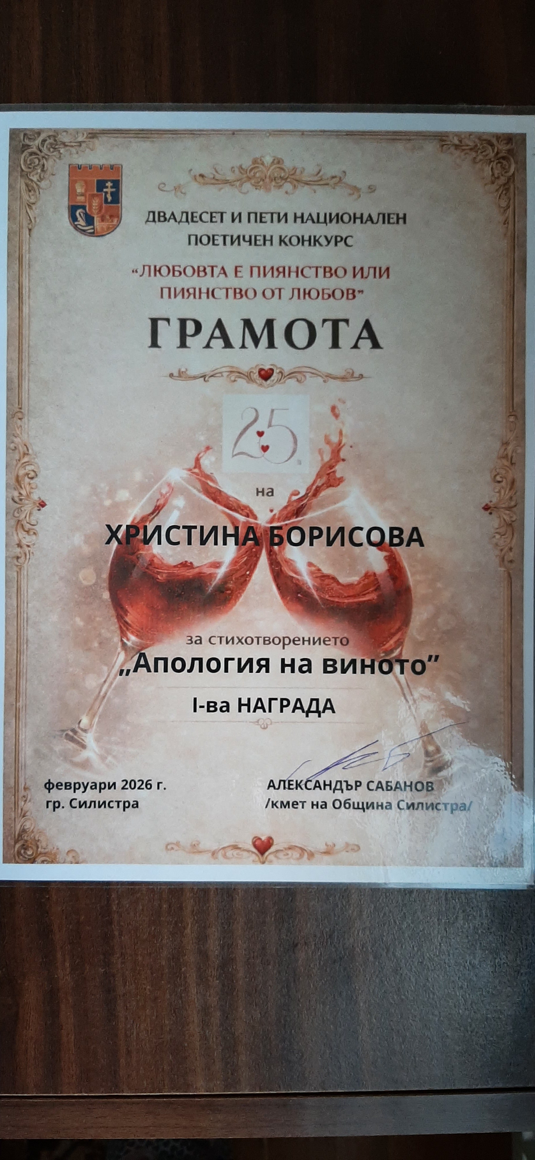 Преди дни беше поставен финалния щрих на юбилейното Двадесет и пето издание на националния конкурс за поезия „Любовта е пиянство или пиянство от любов” в Силистра, на който нашата съгражданка Христина Борисова бе отличена с призовото първо място. Нейното стихотворение „Апология на виното” достойно защити поставената тема и привлече вниманието на компетентното жури с безспорните си художествени качества и овладяно поетично майсторство. И този път поетесата се справи с конкуренцията и без усилие изкачи поредния си личен творчески връх.