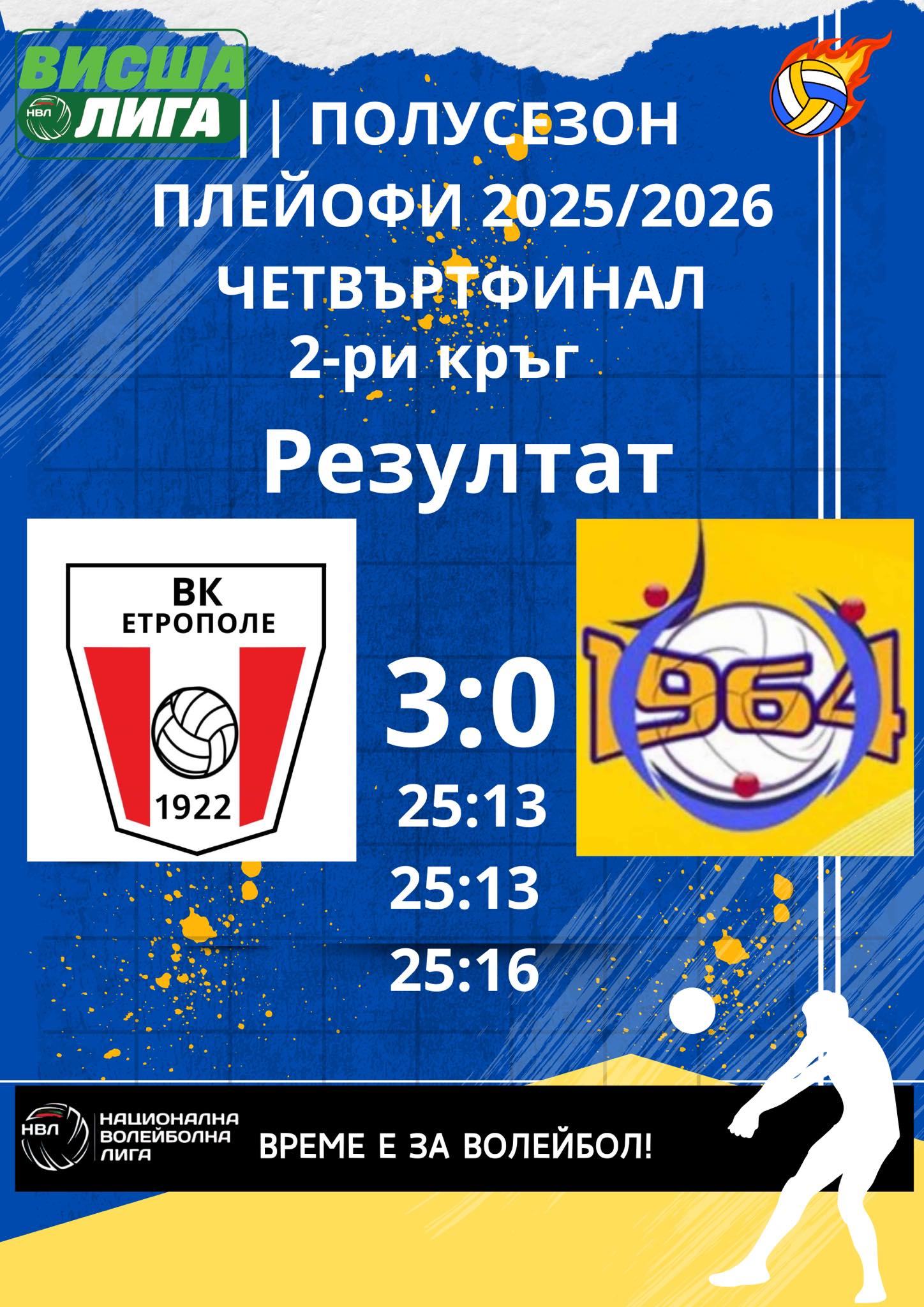 Към полуфиналите продължава носителят на Купата на България Висша лига „Етрополе“. Воденият от Пламен Тодоров тим надигра „Раковски-1964“ (Севлиево) с 3:0 (25:13, 25:13, 25:16) във втория четвъртфинал помежду им. В първия двубой етрополци победиха съперника със същия резултат. Така те спечелиха серията с 2:0 успеха. „Червено-белите“ бяха изцяло доминиращи в срещата и я спечелиха за 62 минути.