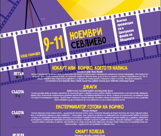 Всички прожекции ще се състоят в централното фоайе на сградата на Община Севлиево и са със свободен вход.
