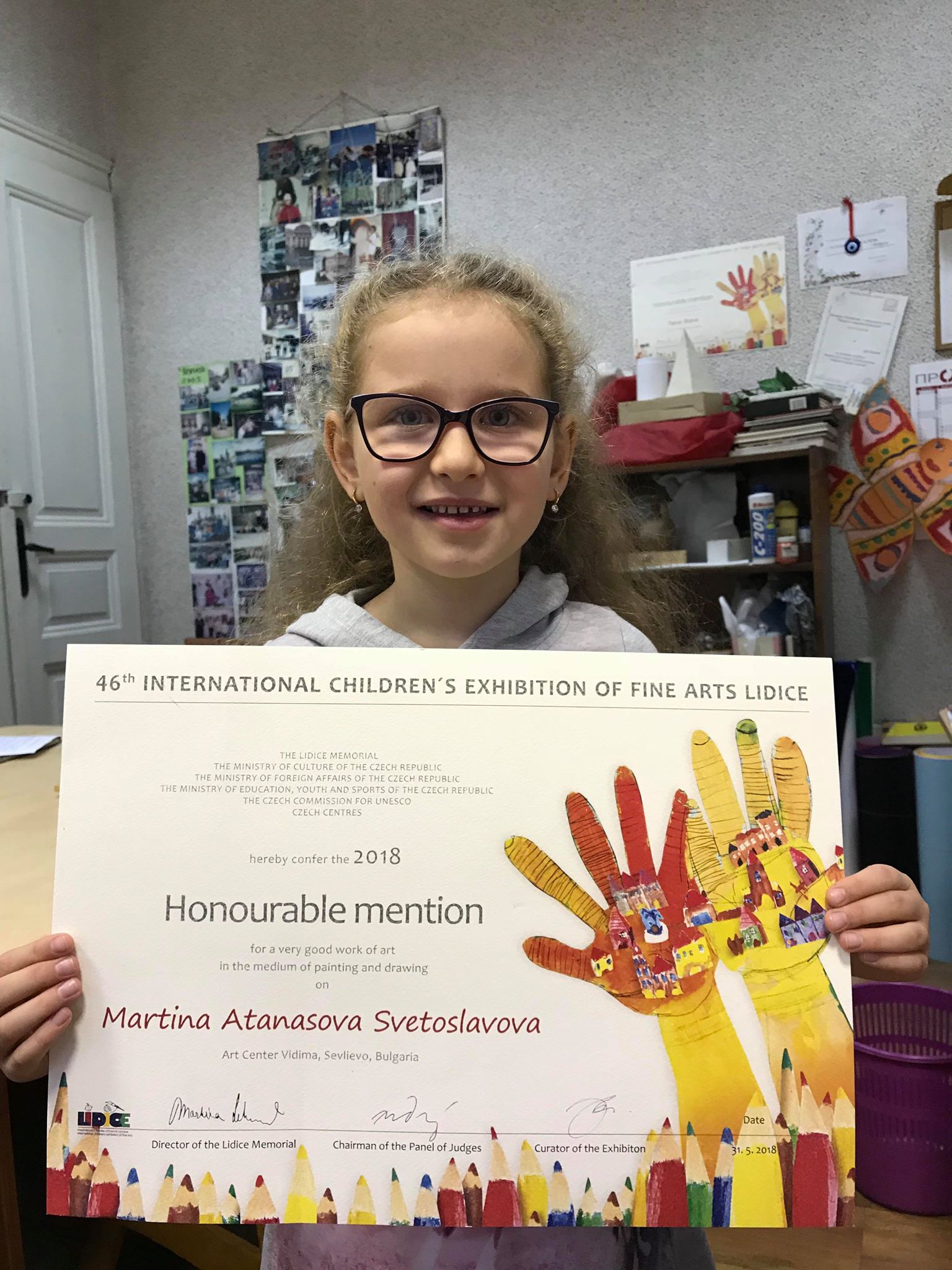 5-годишната Мартина Светославова от артцентър „Видима“ стана носител на Почетното отличие от 46-я международен детски художествен конкурс за рисунка „Лидице 2018“ – Чехия. В тазгодишното издание на артнадпреварата, чиято тема беше „Вода“, са участвали 29 967 рисунки на деца от 79 държави, а малката художничка от Севлиево е едно от 14-те наградени българчета.