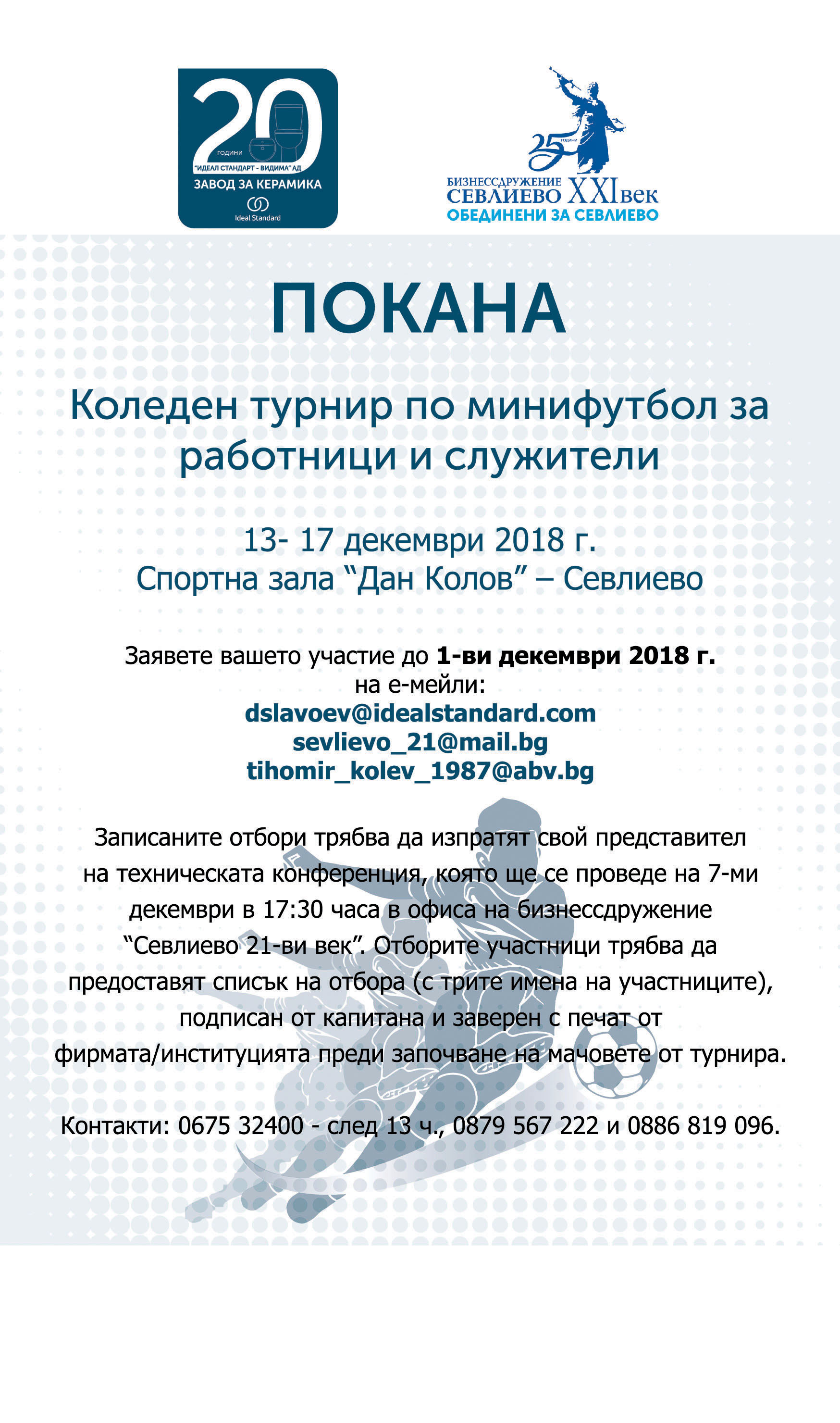 От 13 до 17 декември спортната зала „Дан Колов“ ще бъде домакин на коледен турнир по минифутбол за работници и служители. Крайният срок за записване за участие в надпреварата е 1 декември 2018 г.
