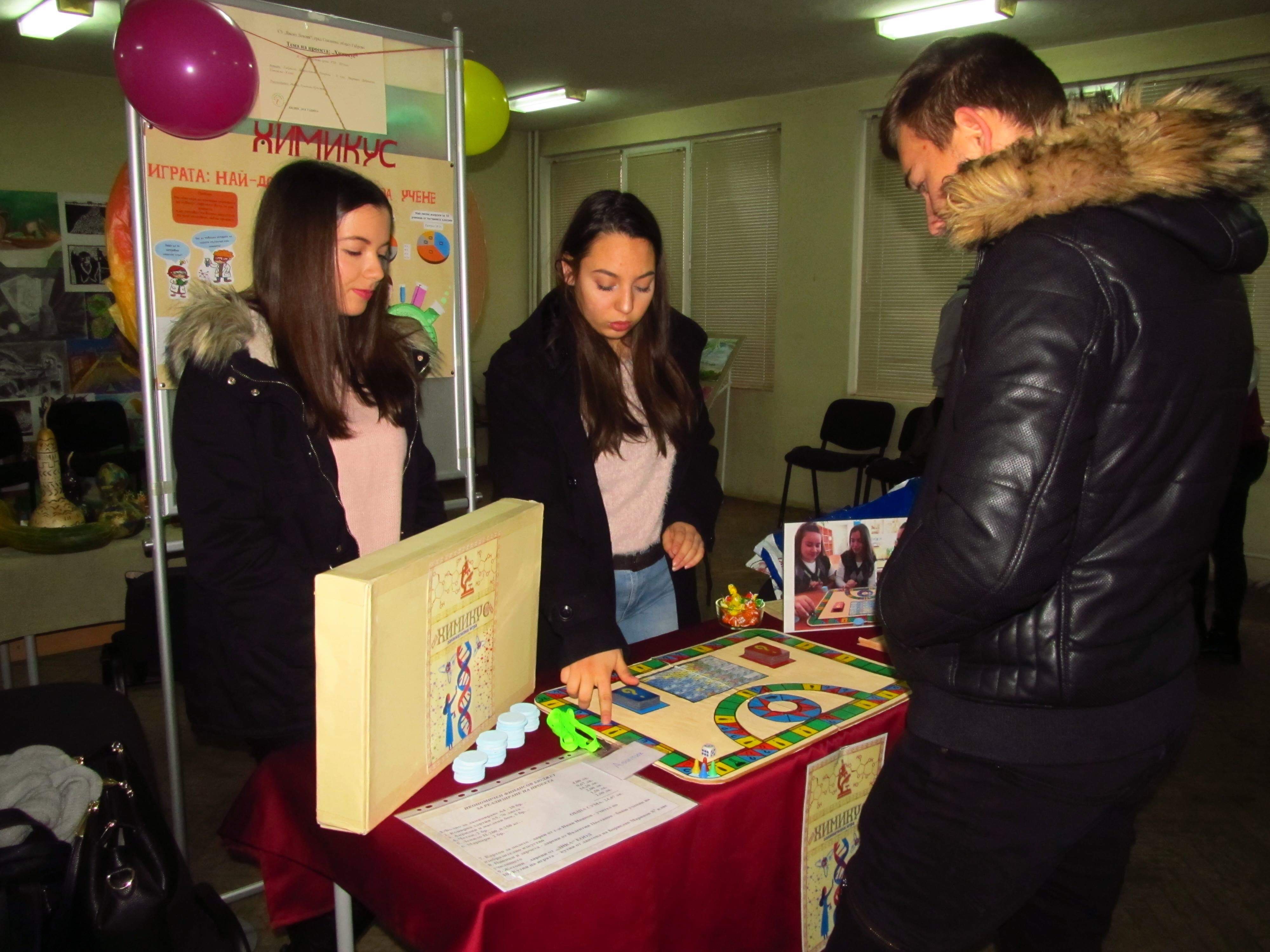 ,,Все повече ученици изпитват затруднения по този не особено любим предмет- химията. Затова ние решихме да създадем занимателна игра на име ,,Химикус”, която да има за цел да помогне на учениците да усвояват по един по-лесен, разбираем и интересен за тях начин учебния материал по химия.”- коментираха Мартина и Габриела. Тяхната настолна образователна игра силно заинтригува както журито, така и останалите участници.