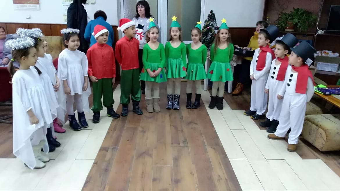 с учителки г-жа Щерева и г-жа Генева, поздравиха в навечерието на празниците възрастните хора от Клуба на пенсионера „Васил Левски“. 6-годишните възпитаници пяха коледни песни, рецитираха стихчета, преоблечени като снежинки, джуджета, снежни човеци, звездички.