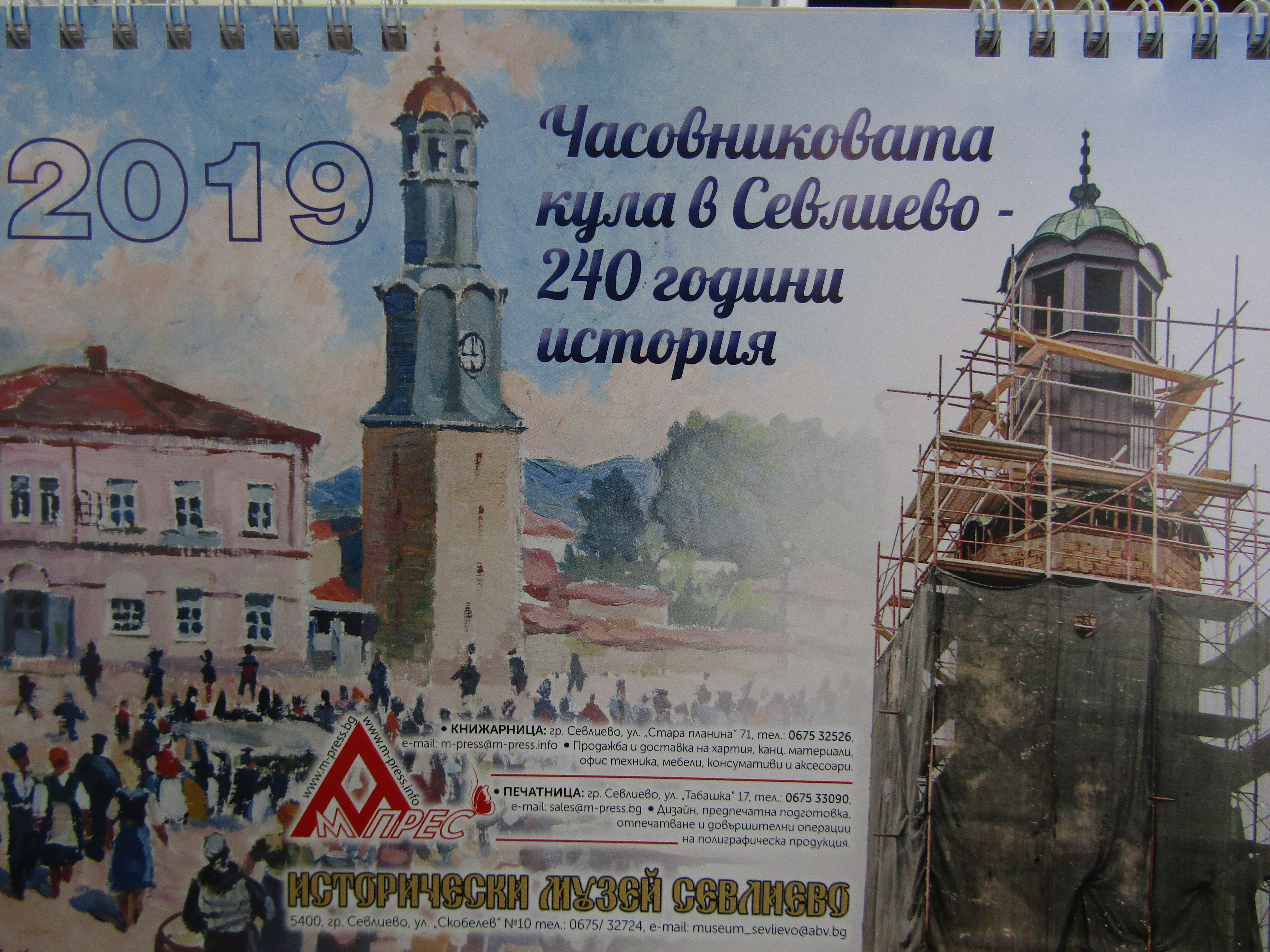 Традиционният календар на Историческия музей за 2019 г., шестнадесетото поред съвместно издание с фирма „М-Прес“, е посветен на Часовниковата кула в Севлиево – 240 години история. Материалите и информацията са подготвени от екипа на Музея, който повече от 60 години с голяма отговорност и любов съхранява историческата памет на нашия град. Използвани са материали, експонати и фотографии от музейния фонд.
