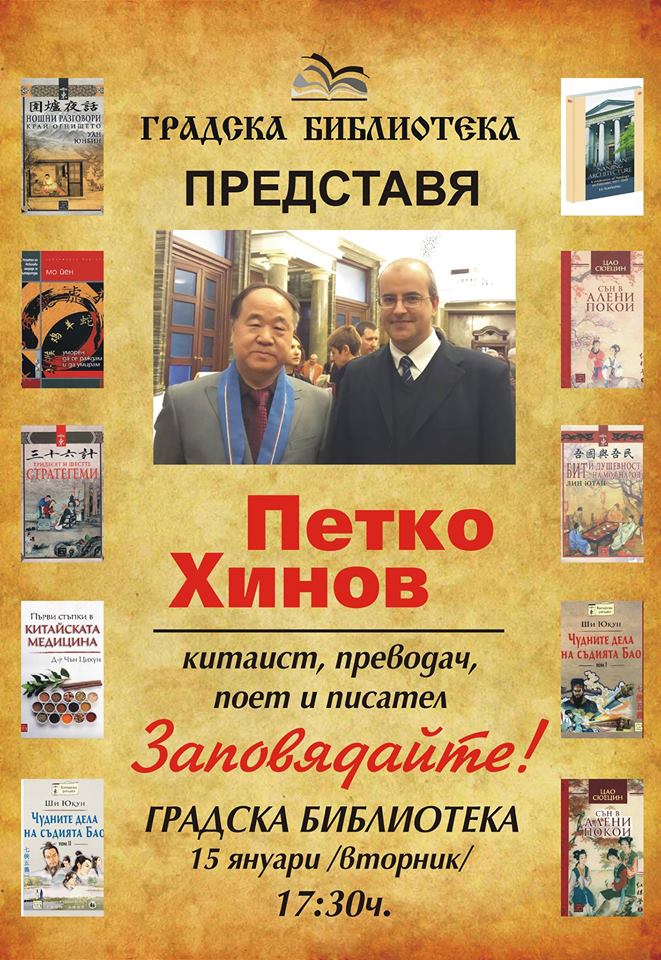За пръв път в Севлиево Петко Хинов ще представи своите преводи на класически и съвременни китайски литературни произведения. Срещата със съгражданите му е планирана за 15 януари, вторник, от 17:30 ч., в Градската библиотека.