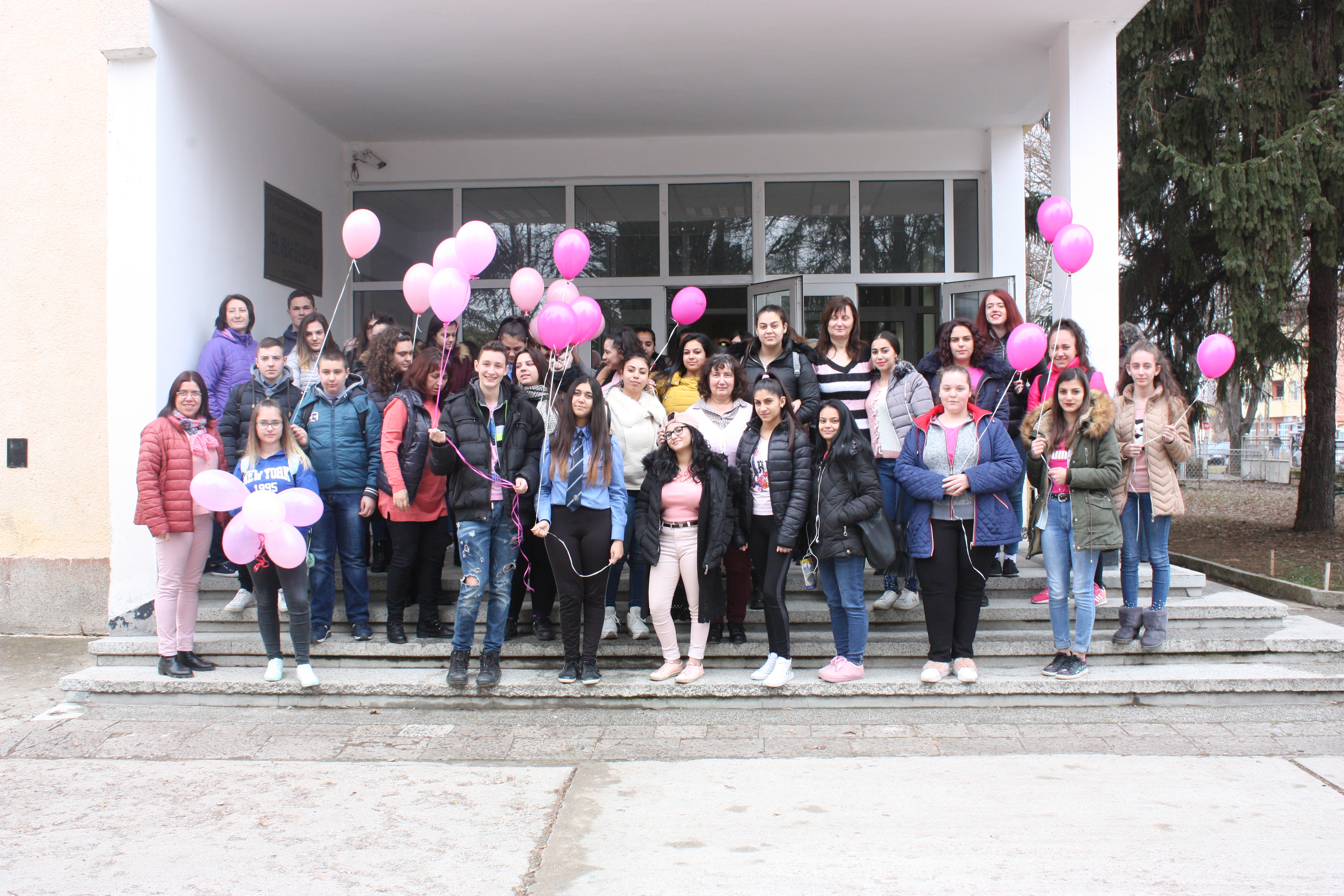 Училищният ученически съвет подготви знаци по повод инициативата – розови сърца-символи, които бяха раздадени на входа на училището на всички ученици, учители, служители, които през целия ден ги носиха в знак на съпричастност на ревера си. Разпространени бяха материали, свързани с Деня на розовата фланелка – на информационното табло във фоайето на училището бяха разлепени постери, а във всеки кабинет бе поставен флаер със стихотворението-символ „Аз съм човекът…“. Изготвена бе презентация, свързана с Международния ден за борба с училищния тормоз, която се излъчваше на екрана във фоайето през целия ден. Всички класове изработиха постери с послания, които бяха поставени във фоайето и коридорите. По инициатива на Ученическия съвет бяха осигурени розови балони с хелий, които учениците пуснаха в голямото междучасие в знак на ангажираност. И тази година по заповед на директора Ани Андреева училищната униформа бе заменена с дрехи и аксесоари в розов цвят. В изразяването на съпричастност чрез облеклото се включиха както ученици, така и учители и служители.