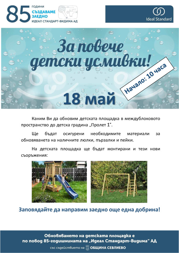 В календара на събитията по повод 85-годишнината на „Идеал Стандарт – Видима“ АД на 18 май, тази събота, от 10:00 часа, е предвидено обновяване на детската площадка, намираща се в междублоковото пространство до ДГ „Пролет 1“ (срещу Пожарната служба). Като дейности обновяването включва освежаване на съществуващите люлки, пързалка и пейки и монтиране на нови съоръжения. Обновяването на площадката ще се извърши със съдействието на Община Севлиево.