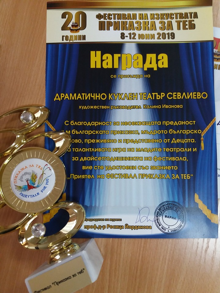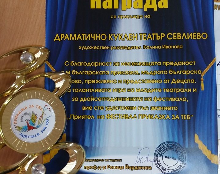 Изключително успешно бе участието на драматично кукления театър при ЦПЛР – Детски комплекс „Йовко Йовков” в ХХ юбилеен фестивал на изкуствата „Приказка за теб”, който се проведе преди седмица в морската ни столица Варна. Ръководителката на трупата – Калинка Иванова, бе подготвила специален поздрав към организаторите и публиката на фестивала. Така малките и големи актьори се представиха от къде са, какво обичат да играят, като техният подарък за юбилейното издание на празника бе приказката „Момчето с празната саксия”.