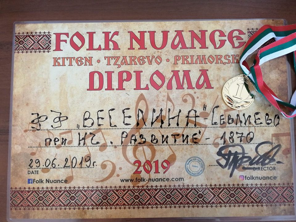 Със златен медал и диплом се завърна от участието си в международния фестивал Folk nuance („Фолклорни нюанси“) фолклорна формация „Веселина“. На 29 юни гласовитите изпълнители на Веско Самуилов изнесоха 30-минутен концерт в Лозенец. Това е фестивал, на който си дават среща формации от страната и чужбина под мотото „Китен, Лозенец, Царево, Приморско, пеят, заиграват и морето разлюляват“. Преди да излязат на сцената, музикантите и певиците от Севлиево дефилираха по улиците на градчето.