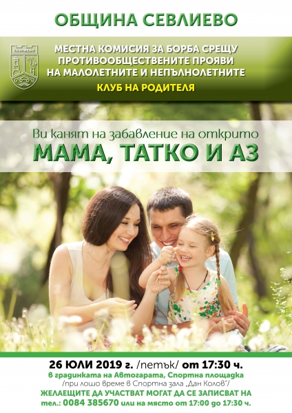 Инициативата „Мама, татко и аз“ е част от кампанията на общинската комисия и в изпълнение на дейностите от програмата за 2019 г. на Клуба на родителя. Клубът е помощен орган на Местната комисия за борба срещу противообществените прояви на малолетните и непълнолетните при Община Севлиево.