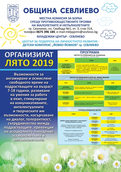 Поредица от игри и занимания през лятото е подготвила Община Севлиево за подрастващите в града. За втора поредна година Местна комисия за борба срещу противообществените прояви на малолетните и непълнолетните при Община Севлиево, заедно с Центровете по превенция и Клуб на родителя, организират занимания за младежите през ваканционните дни – „Лято 2019“. Забавленията са част от общопревантивната дейност на общинската комисия и се провеждат съвместно с Младежки център – Севлиево и ЦПЛР – ДК „Йовко Йовков”. От Общината са предвидили през летните месеци редица спортни мероприятия, настолни игри, рисуване, прожекция на филми и театрални постановки.