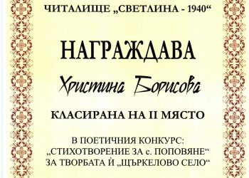 Поетесата от Севлиево Христина Борисова се завърна с втора награда от Щъркеловото поетично четене в с. Поповяне, община Самоков, което ...