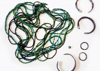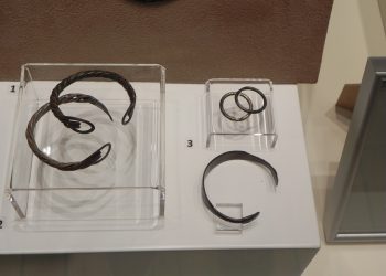 Огърлицата, трите гривни и двете сребърни обици – едната от тях позлатена, които са намерени в гроб на млада жена, ...